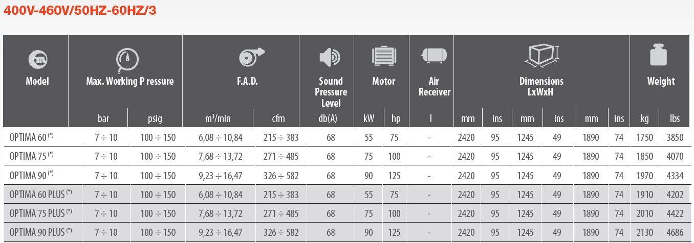 Optima 60-75-90 series rotary vane compressors are designed to meet the needs of a production that is particularly energy efficient. Equipped with an inverter, this model ensures energy savings up to 35% in comparison with other rotary compressors.