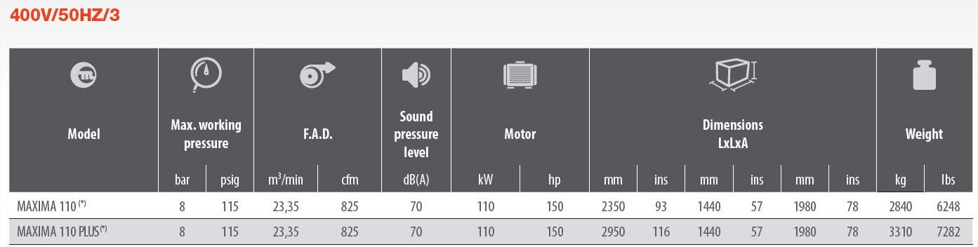 When a steady flow of compressed air supplied for a prolonged period of time is needed, Maxima 110 air compressors are the ideal solution to cut production costs and energy consumption.
