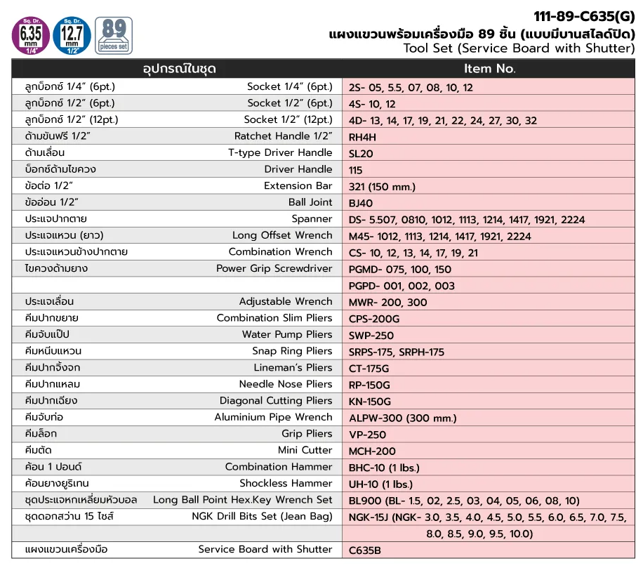 แผงแขวนพร้อมเครื่องมือ 89 ชิ้น (111-89-C635(G)